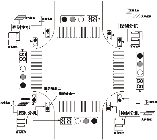 控制器。由4臺(tái)HD205A信號(hào)機(jī)組成,每臺(tái)信號(hào)機(jī)分別負(fù)責(zé)一個(gè)街角信號(hào)燈的輸出管理以及電源管理。其中一臺(tái)為主機(jī)、三臺(tái)為分機(jī),由用戶根據(jù)習(xí)慣現(xiàn)場(chǎng)設(shè)置。主機(jī)根據(jù)預(yù)先設(shè)定的相位方案和時(shí)段方案控制整個(gè)路口信號(hào)燈的協(xié)調(diào)運(yùn)行,同時(shí)負(fù)責(zé)一個(gè)街角的信號(hào)燈輸出以及電源管理;從機(jī)信號(hào)機(jī)根據(jù)預(yù)先設(shè)定的地址,自動(dòng)提取主機(jī)通過(guò)無(wú)線形式下發(fā)的燈色信息并轉(zhuǎn)換為燈色輸出,同時(shí)向主機(jī)報(bào)告自身運(yùn)行狀態(tài)信息,如燈色輸出反饋信息、蓄電池電壓狀態(tài)、太陽(yáng)能電壓狀態(tài)等等。關(guān)于信號(hào)機(jī)的功能特點(diǎn)另章描述。由于采用太陽(yáng)能供電,信號(hào)機(jī)必須時(shí)刻監(jiān)視自身供電系統(tǒng),盡一切可能節(jié)約用電,延長(zhǎng)在太陽(yáng)光照不足情況下信號(hào)燈的正常工作時(shí)間。信號(hào)機(jī)根據(jù)光-電轉(zhuǎn)換效能判斷白天和黑夜、晴天和陰雨天,并根據(jù)光線狀態(tài)通過(guò)PWM調(diào)整信號(hào)燈的供電電壓。