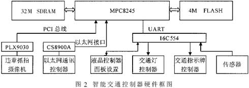 智能交通控制器硬件框圖如圖2所示,MPC8245擴(kuò)展了32M SDRAM和4M FLASH存儲器,其中,4M FLASH用來存儲Linux內(nèi)核和應(yīng)用程序,32M的SDRAM在系統(tǒng)運(yùn)行的時(shí)候存儲Linux的內(nèi)核和應(yīng)用程序。違章抓拍控制器通過PCI總線接口芯片PLX9030接入MPC8245,系統(tǒng)可以兼容各種不同的違章抓拍控制器,通過編寫不同的驅(qū)動程序來實(shí)現(xiàn)。以太網(wǎng)控制器通過以太網(wǎng)接口芯片 CS8900A接入MPC8245,可以接入Internet,加入光線接口就可以實(shí)現(xiàn)光纖通訊。通過MPC8245的UART口擴(kuò)展了一片 16C554,擴(kuò)展出了四個串口,分別接入液晶控制器、交通燈控制器、交通指示牌控制器和傳感器。液晶控制器用來設(shè)定或者修改智能路口控制器控制參數(shù),而且還可以通過手動直接控制交通燈。交通燈的控制是直接控制交通燈,接收來自MPC8245的參數(shù)設(shè)定,比如路口數(shù)、紅綠燈時(shí)間等,并控制交通燈。交通指示牌是用來提供交通信息的大屏幕,MPC8245接收來自控制中心的交通信息,并將這些信息送到交通指示牌控制器,顯示在大屏幕上,用來疏導(dǎo)交通。檢測設(shè)備在目前交通控制中的作用越來越重要,各種檢測設(shè)備不但種類繁多,而且新產(chǎn)品不斷涌現(xiàn),因此TCS-0602預(yù)留了包括串口在內(nèi)的多種接口方式。