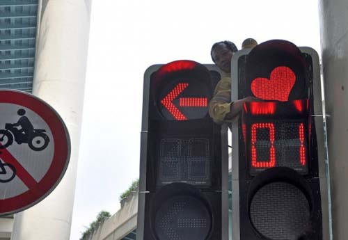14、上海延安西路中山西路路口紅燈,2011年5月9日,位于上海延安西路中山西路路口的某個(gè)紅燈呈現(xiàn)愛(ài)心形狀,這個(gè)個(gè)性信號(hào)燈受到網(wǎng)友熱捧。9日中午,相關(guān)施工人員將蒙在紅燈上的愛(ài)心蒙版摘取下來(lái)。